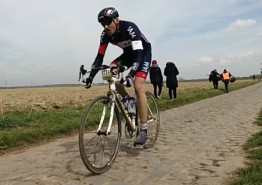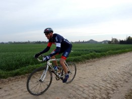 Hinter der nächsten Kurve ziehe ich während der Fahrt mein Werkzeug aus der Tasche und ziehe zwei Schrauben am Lenker nach. Ab jetzt noch 17 Pavés und 107 km. Ich fahre immer noch allein, an allen vorbei, bis mich auf der Geraden endlich jemand einholt. Ich hänge mich sofort ans Hinterrad und freue mich, mit jemanden fahren zu können, der mich mal „aus dem Wind nimmt“. An den Pavés bin ich vorne und auf den Geraden teilen wir uns ein. Das geht 20 km gut, dann stürzt er hinter mir auf dem Pavé in einer 90° Kurve und landet im Acker. Am Ende des Pavés hängt sich wieder einer ran, der mich auf den nächsten Kilometern begleitet, bis auch er im Acker landet. Schade! Mit den Beiden hat es mehr Spaß gemacht, und nun wieder allein weiter!